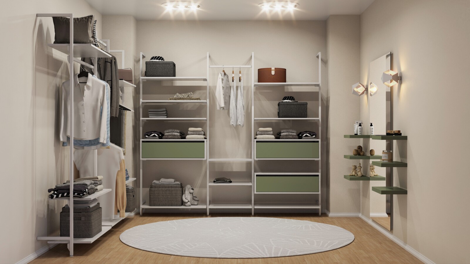 Ogni elemento – dai ripiani alle barre appendiabiti, dai cassetti ai tavoli centrali – è completamente regolabile in altezza, per offrire la massima versatilità e adattarsi allo stile di vita di chi la utilizza.