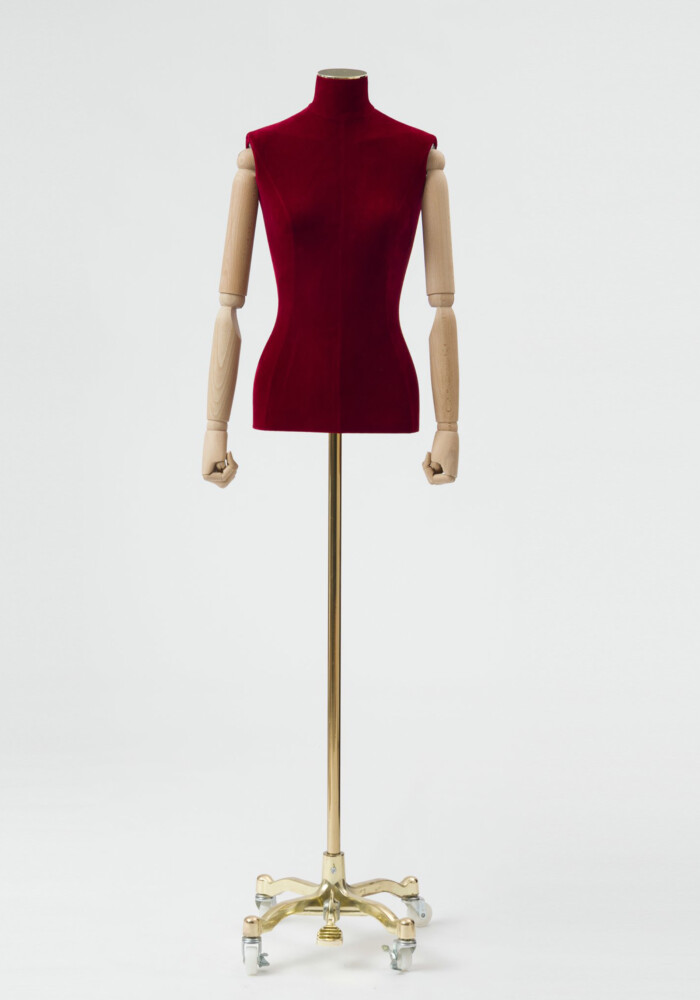 Busto sartoria donna in velluto rosso pompeiano con braccia snodate in legno, tappo collo oro, base americana oro