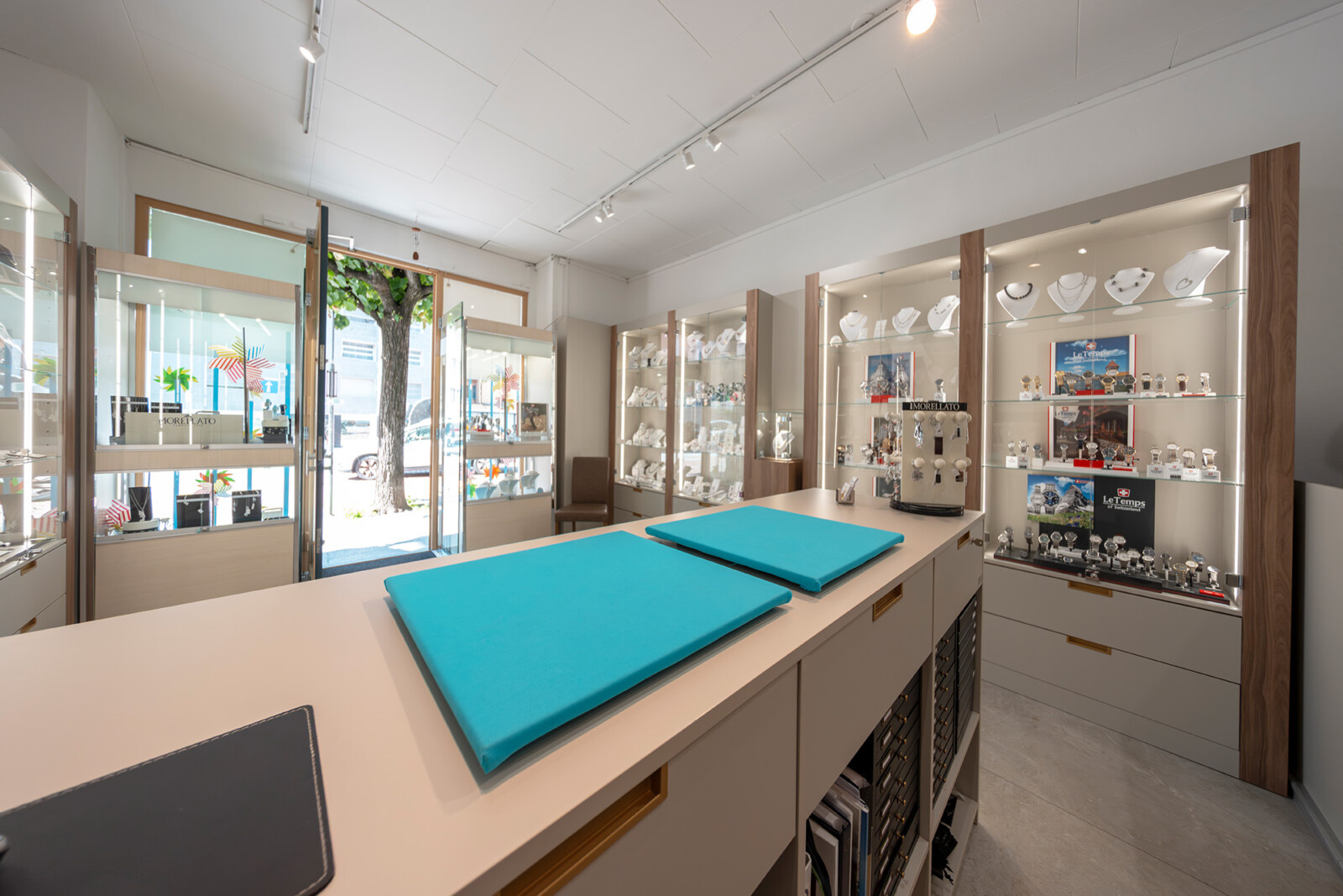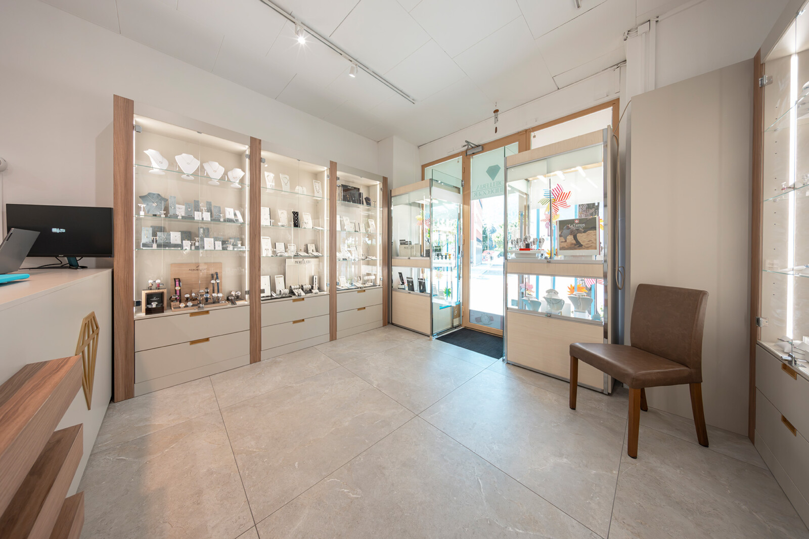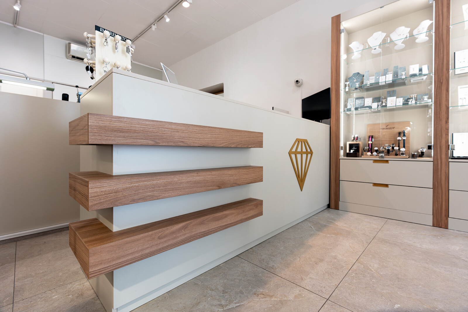 Per la gioielleria Scheidegger di Bellinzona abbiamo progettato un ambiente chiaro e contemporaneo, dove il tono sabbia delle strutture dialoga con il legno noce cannella, creando una cornice calda ma discreta alle collezioni esposte.