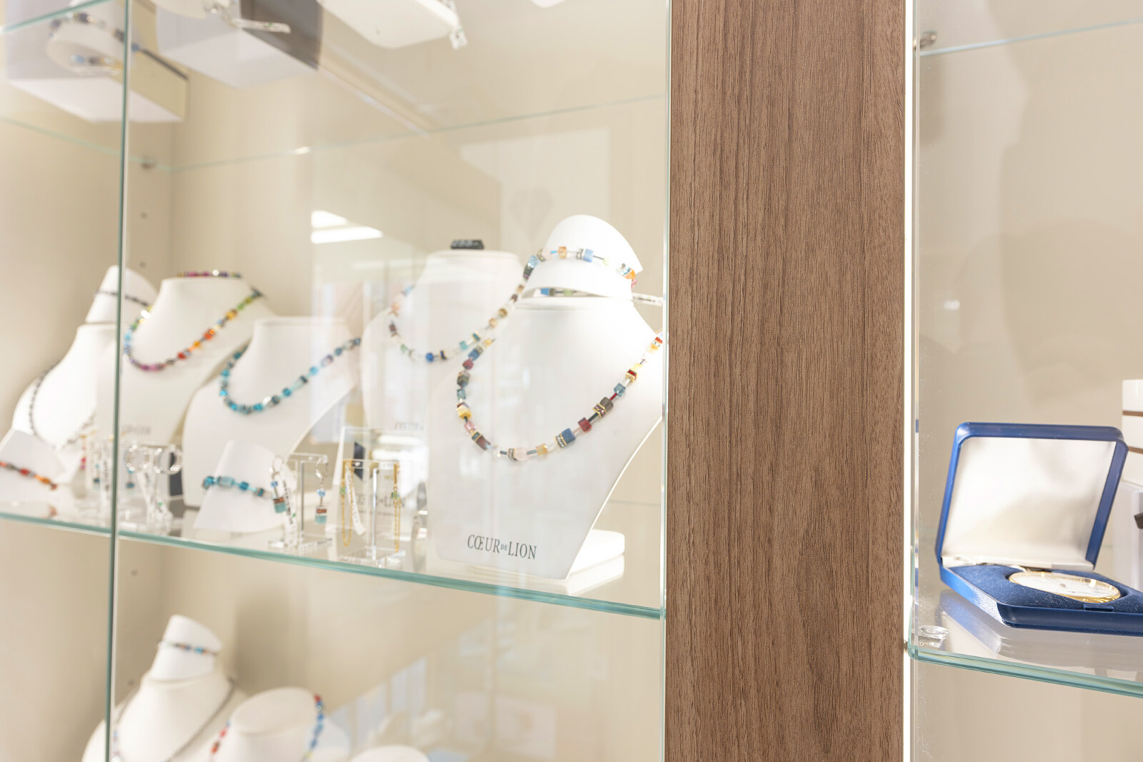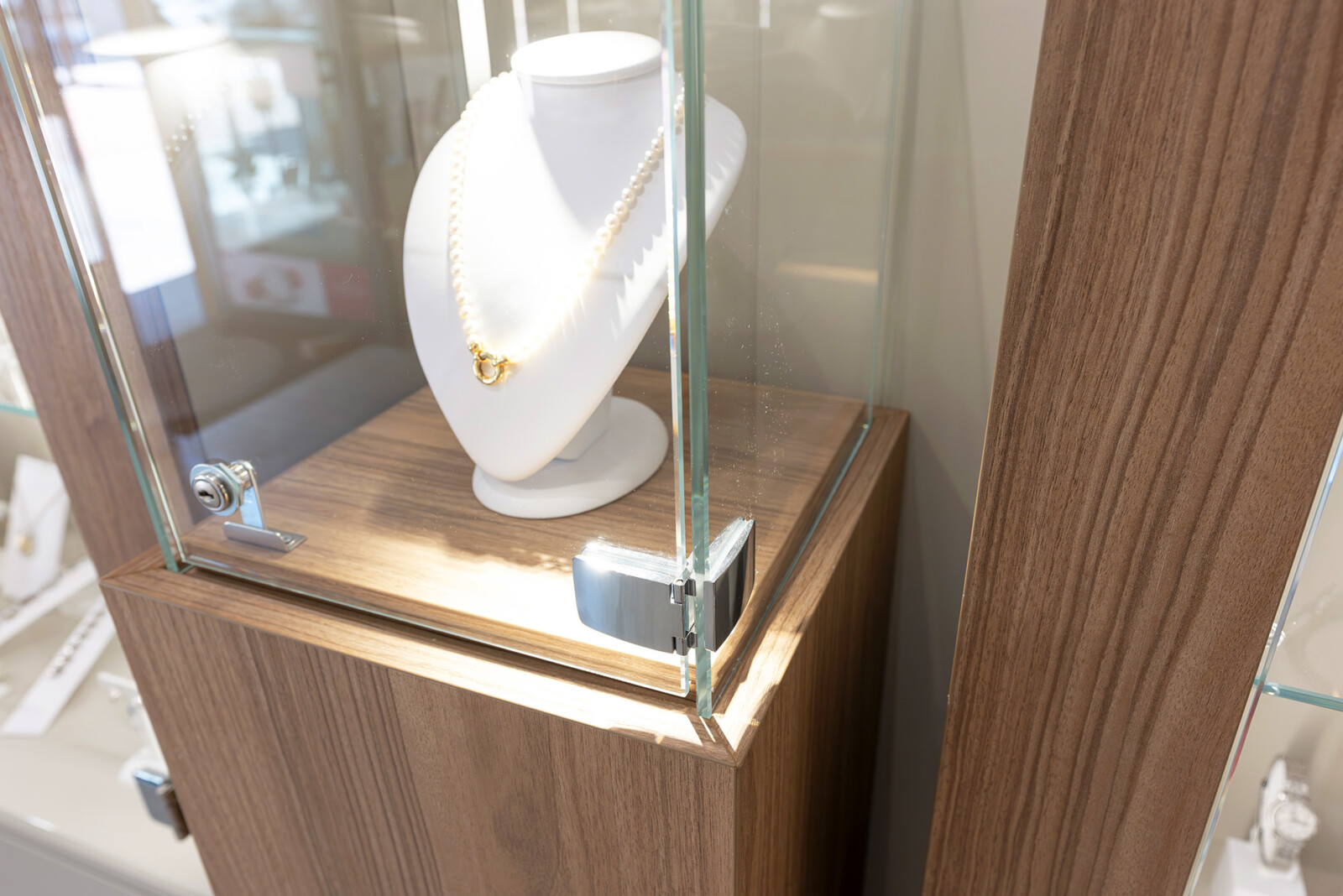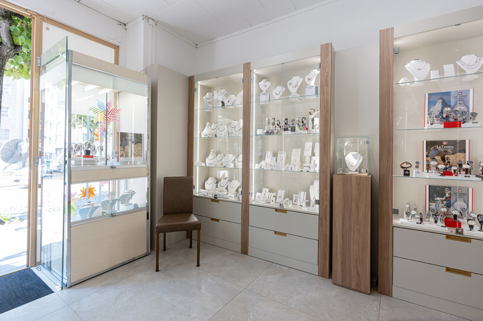 Per la gioielleria Scheidegger di Bellinzona abbiamo progettato un ambiente chiaro e contemporaneo, dove il tono sabbia delle strutture dialoga con il legno noce cannella, creando una cornice calda ma discreta alle collezioni esposte.