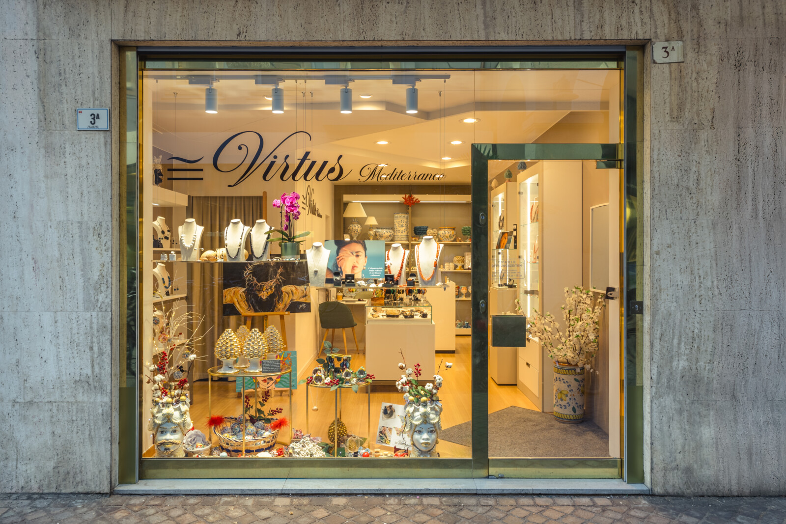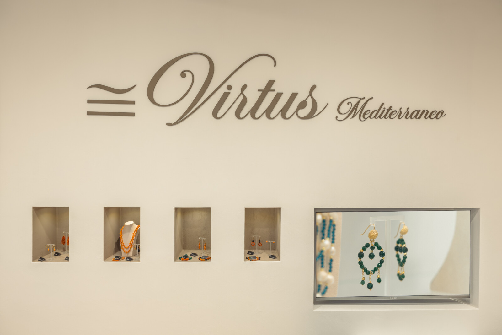 Virtus Mediterraneo è un negozio di modesta superficie, ma progettato come uno spazio su misura: pochi metri, massima cura del dettaglio. In 40 mq abbiamo sviluppato cartongessi, palette colori, luci e arredi, trasformando l’ambiente in una piccola galleria per gioielli e oggettistica.